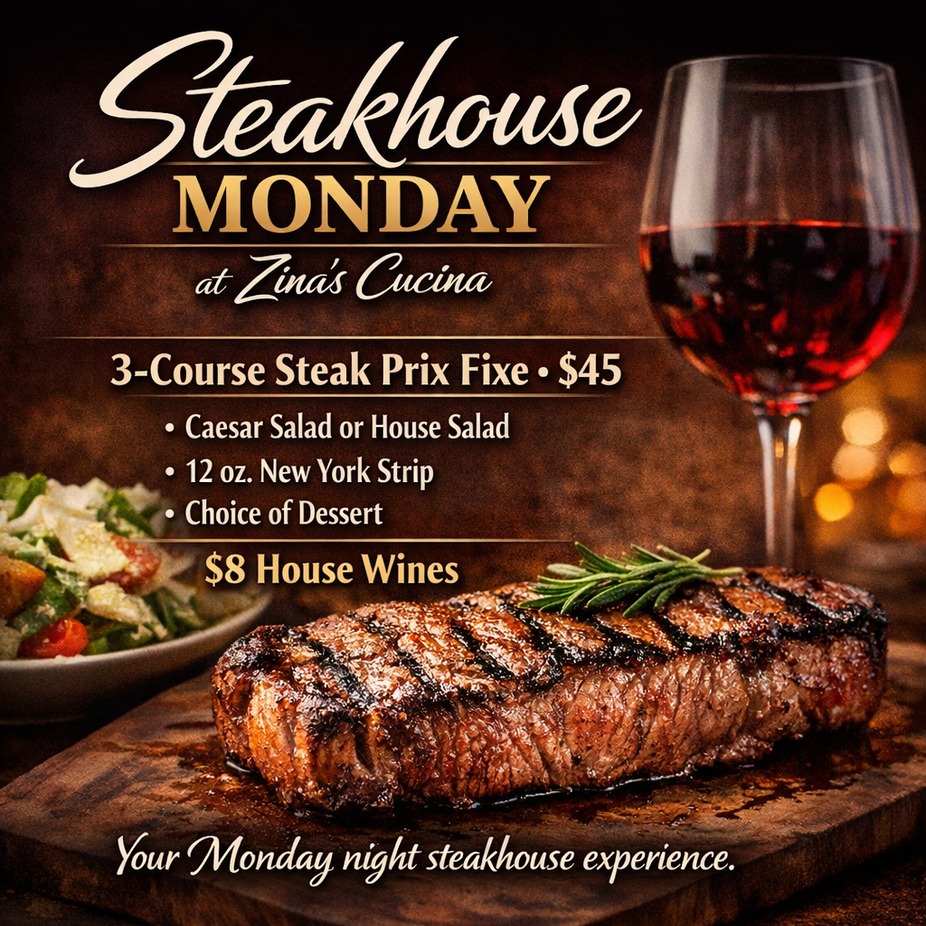 Join us for Steakhouse Monday at Zina’s Cucina — a 3-course steakhouse-style prix fixe for $45 featuring a fresh Caesar or house salad, a 12 oz. New York Strip, and your choice of dessert, plus $8 house wines.