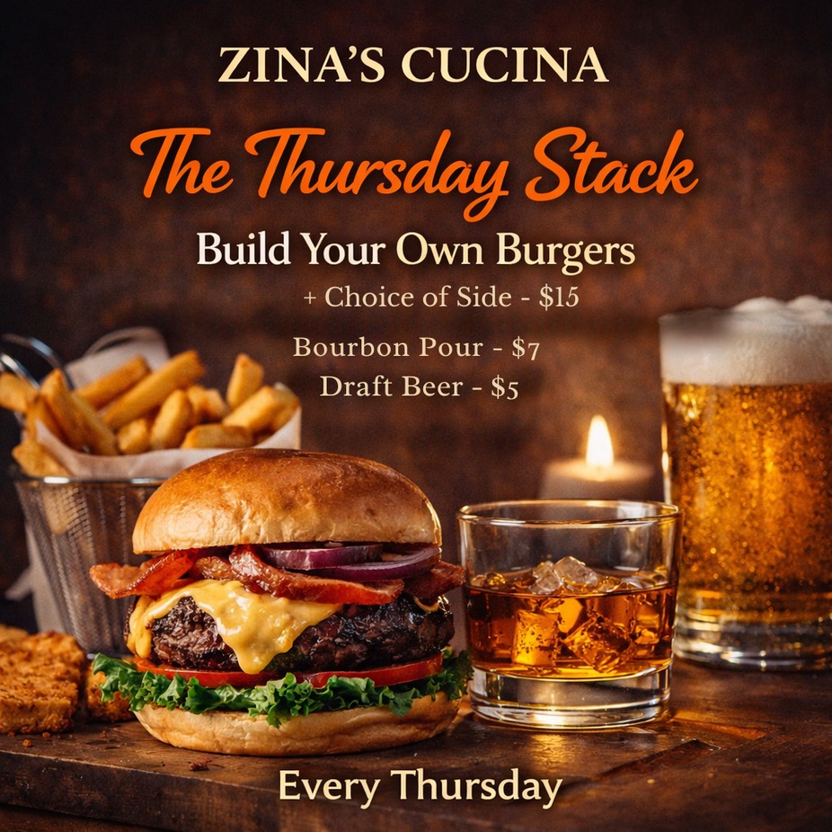 It’s The Thursday Stack at Zina’s Cucina — build your burger, grab a bourbon, and settle in.